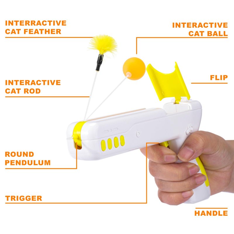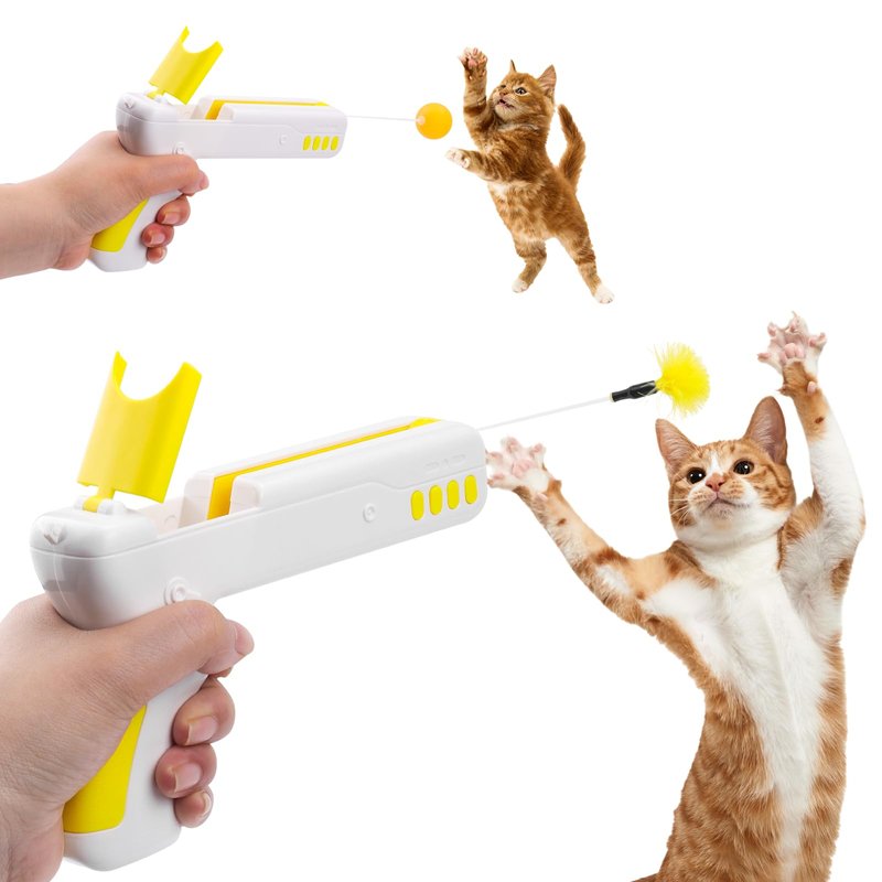 Mity rain Cat Toy, 2-in-1 Interactive Exercise Toy for Indoor Cats, Switchable Ball and Feather Launcher Gun, Yellow ABS, 741 Model, Portable, Lightweight