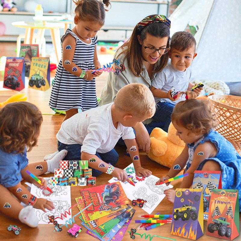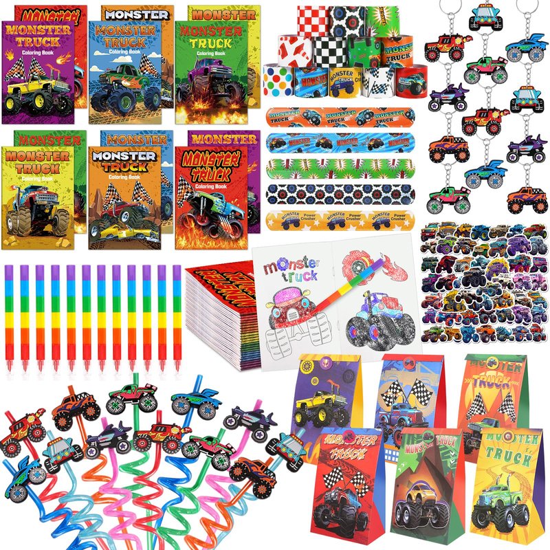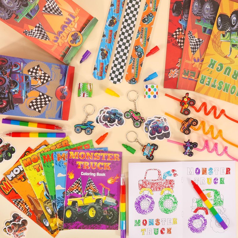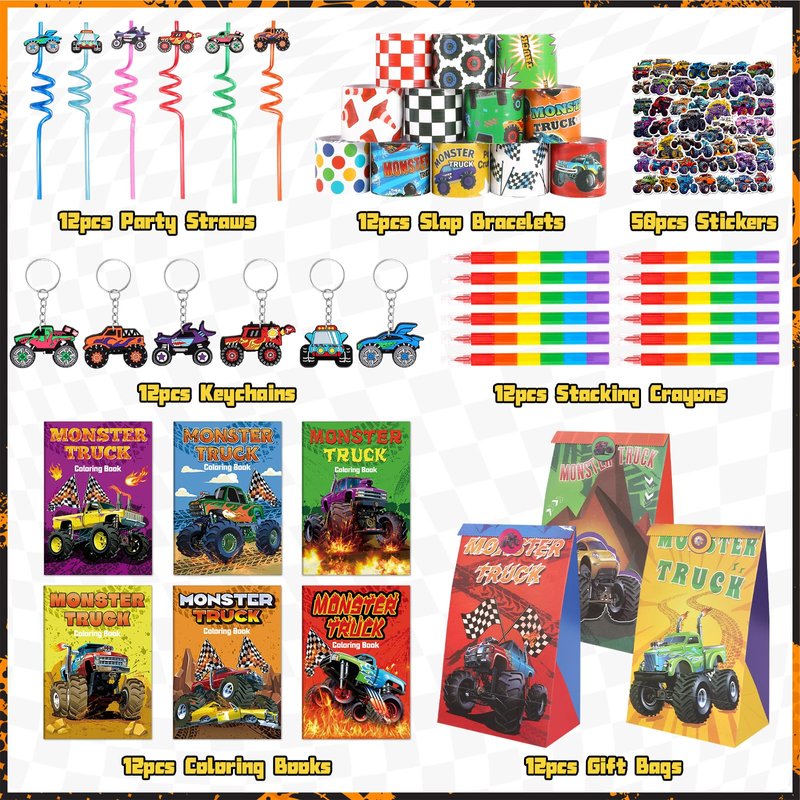 - Luxurious Monster Truck Party Favors Set: We have carefully prepared 122 pieces of monster truck birthday party favors which include 12pcs coloring books(6 styles), 12pcs stacking crayons, 12pcs food-grade plastic straws (6 styles), 12pcs slap bracelets, 12pcs key chians, 12pcs gift bags and 50pcs machine jam stickers, enough quantity to meet your party needs.
