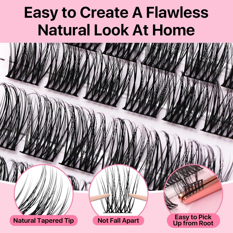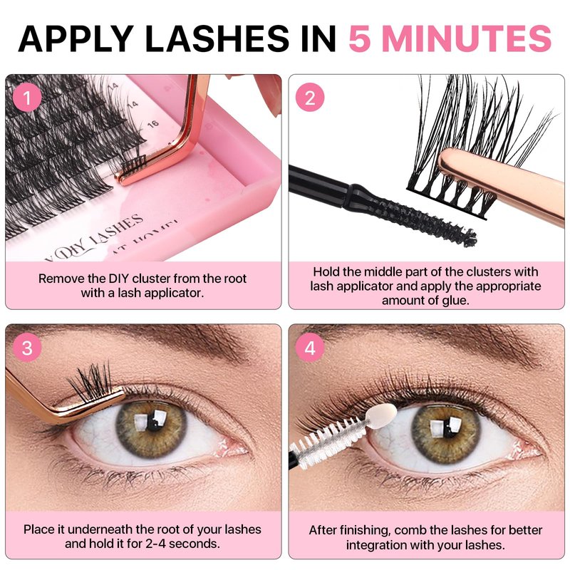 - Apply Lashes In 5 Minutes: Gently brush your natural lashes with lash bond, then place cluster underneath your natural lashes for a comfortable and natural look, squeeze clusters against your lashes, wait 15s and apply lash seal to lock the bond