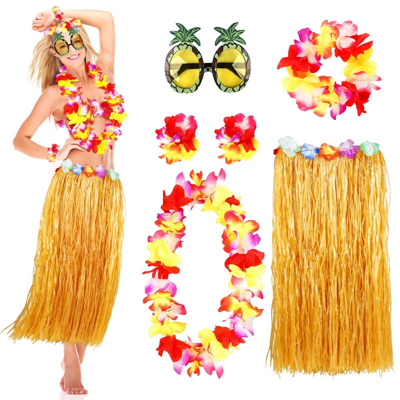 - This tropical dancer set includes skirt, pair of flower bracelets, flower headband, flower necklace and pineapple sunglasses. Hula skirt featuring an adjustable elasticated waistband and decorated by colorful flowers, more beautiful and cute.