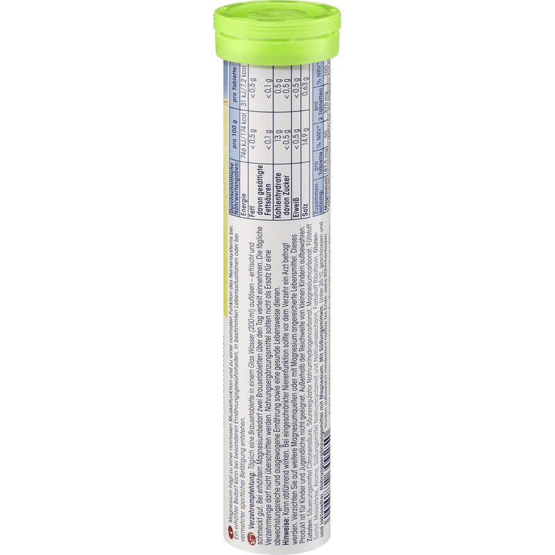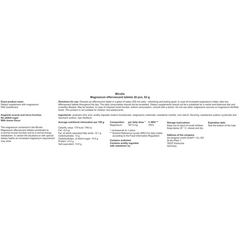 Dissolve one magnesium effervescent tablet in a glass of water (200 ml) twice a day. Note: The daily consumption must not be exceeded. Dietary supplements should not be used as a substitute for a varied and balanced diet as well as a healthy lifestyle. Keep out of reach of small children. The product is not suitable for children under 4 years.___ Nutrition facts. Serving size: 100 g. Calorific value: 172 kcal / 738 kJ; Fat: <0.1 g, Fat, of which saturated fatty acids: <0.1 g; Carbohydrates: 13 g, Carbohydrates, of which sugar: 0.2 g; Protein: <0.1 g; Salt equivalent: 14.9 g.___Contains acidulant, acidity regulator. With sweeteners. Store below 25 ° C, closed and dry. Hersteller: dm-drogerie markt GmbH + Co.KG, Carl-Metz-Str. 1, 76185 Karlsruhe.