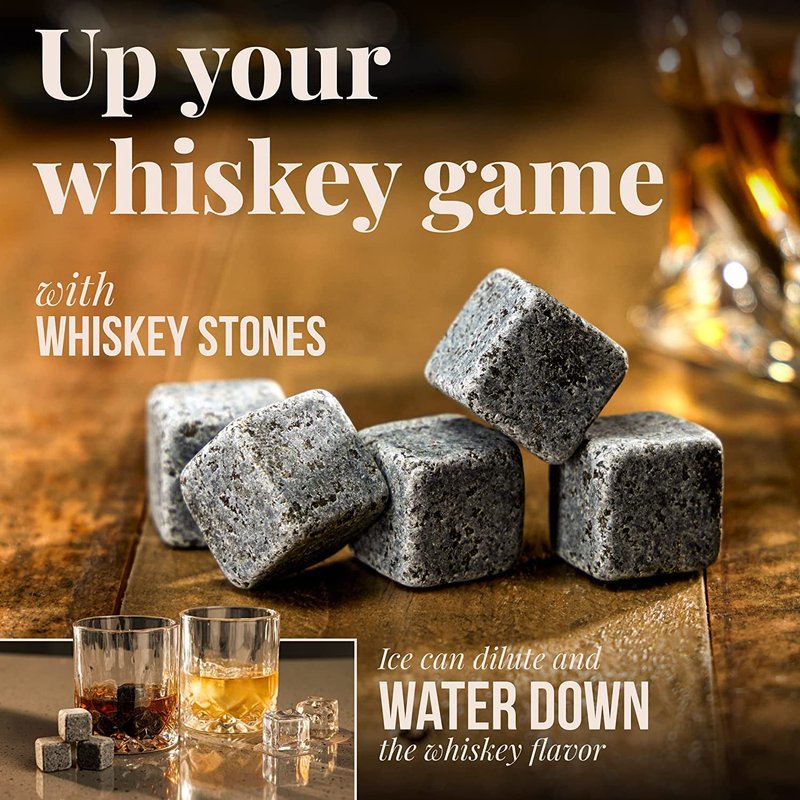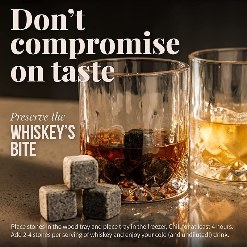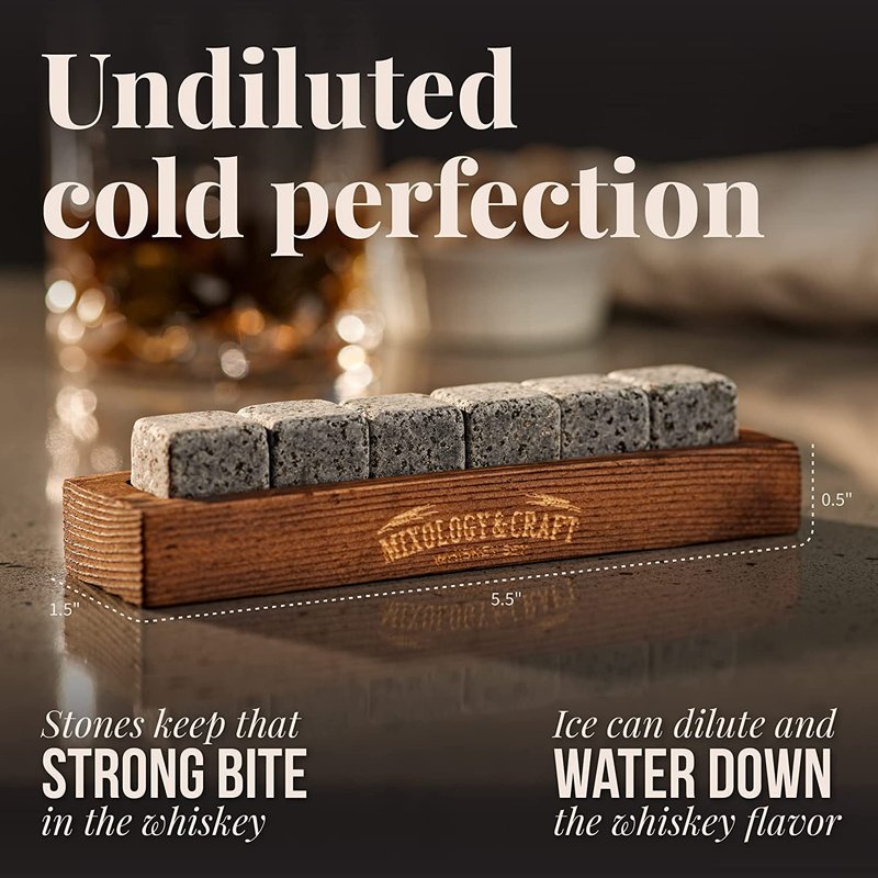 - What's Included - Upgrade your happy hour with this whiskey stones gift set that includes 6 cube-shaped natural granite whiskey stones and a wooden tray for easy organization and freezer storage.