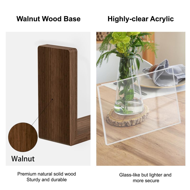- 【Sturdy Construction】The base of the frame is crafted from natural walnut wood, known for its strength and longevity. Highly clear acrylic plexiglass has the same transparency as real glass but lighter and safer to use, well protect your photos from dust or damage.