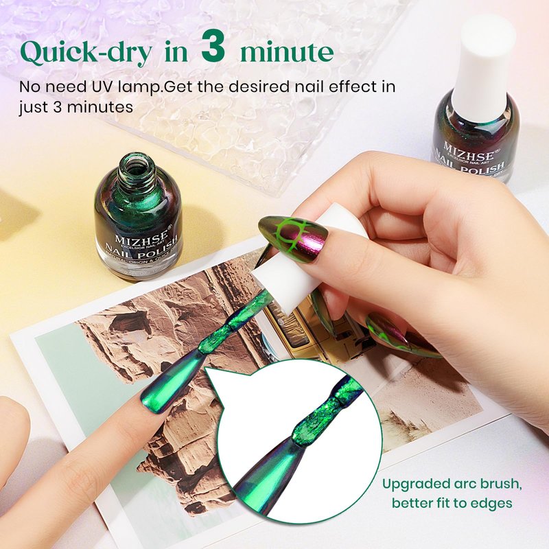 - 【MIZHSE Chameleon Nail Polish】1 x 15ml/0.5 fl oz chameleon nail polish. The nail polish is high pigmented that makes the nails shiny. Can get different color effects based on different lights and viewing angles. Professional nail polish for infinite styles.