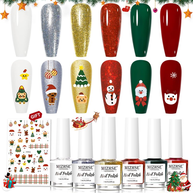 - Christmas Nail Polish Set: MIZHSE 6pcs x 7ml/0.24oz New Year quick dry nail polish set, well-selected 6 Christmas colors with 1pcs Nail Stickers. From sparkling reds to greens and slivers, these vibrant colors capture the essence of the new year, allowing you to create captivating nail designs that will make you attractive at any holiday gathering.