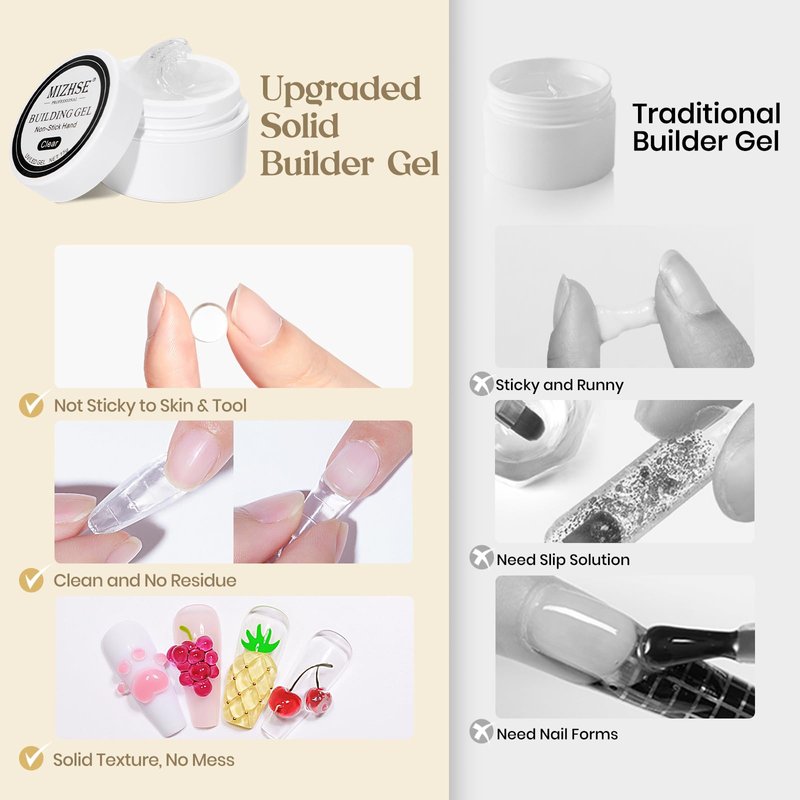 - Solid Builder Gel for Nails: MIZHSE upgraded 3-in-1 solid builder gel contains 15 g (0.53 oz) hard gel, 36 pcs nail forms. Widely use it as gel nail builder, nail extension gel, acrylic nails or press on nails, nail rhinestone glue gel and nail sculpture gel for 3D nail art decorations DIY.