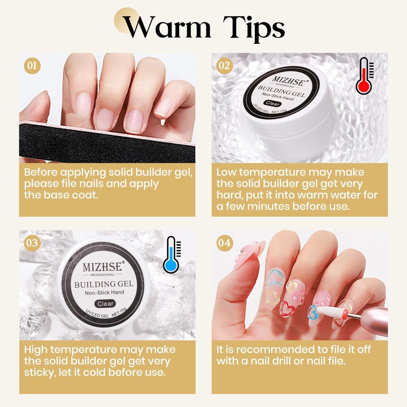 - Warm Tips of Nail Builder Gel: The solid builder gel may be hard at low temperature, please put it into warm water for a few minutes before use. And please keep the hard gel for nails in a cool place when the weather is hot. Base and top coat required, cure under UV/LED nail dryer lamp. Any problems, please feel free to contact us.