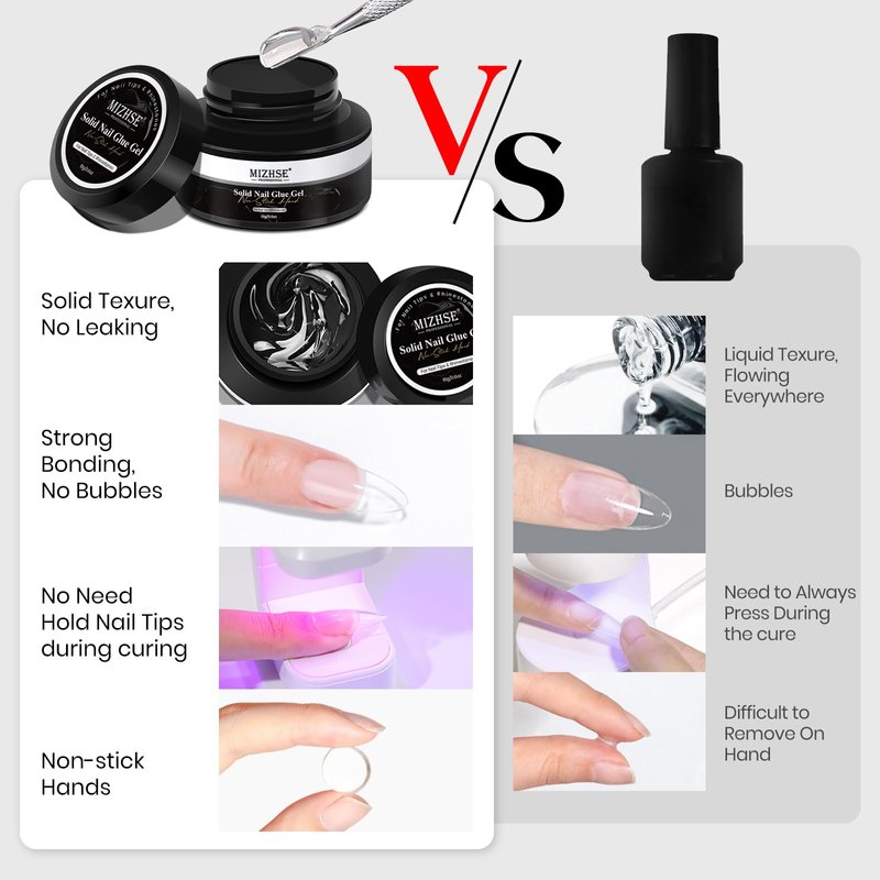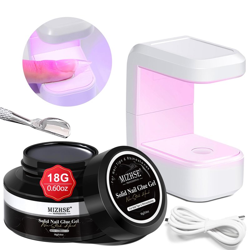 - Solid Nail Glue Gel Kit: Solid nail gel glue kit includes 18 g solid gel nail glue and an 8W Mini UV LED lamp for nail curing. MIZHSE solid gel nail glue made of upgraded formula with strong adhesion, allowing you to firmly and eaily apply nail tips or press on nails. And suitable for both flat nails and curved nail beds