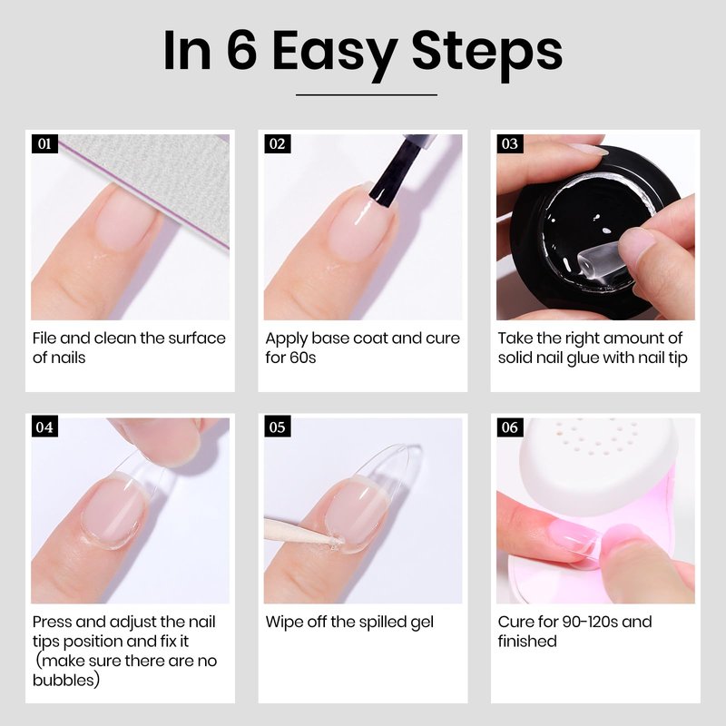 - User Direction: 1.File and clean the surface of the nails. 2.Apply base coat and cure. 3.Take the right amount of solid nail glue gel with nail tip. 4.Press and adjust the nail tip position and fix it. 5.Wipe off and spilled gel and cure for 90s, and then you apply gel polish, dip powder or other nail products