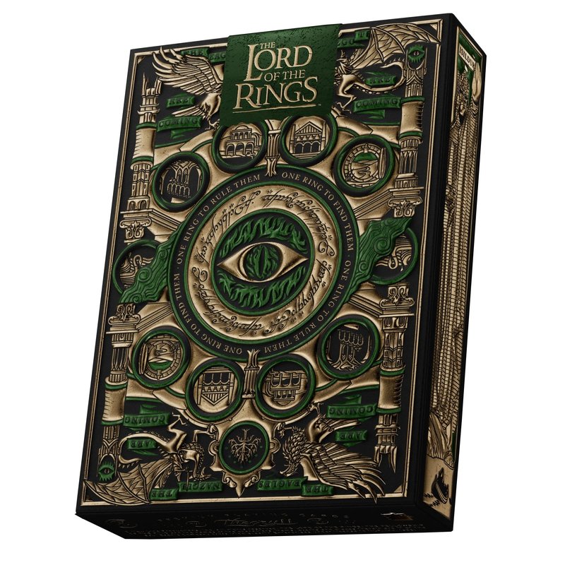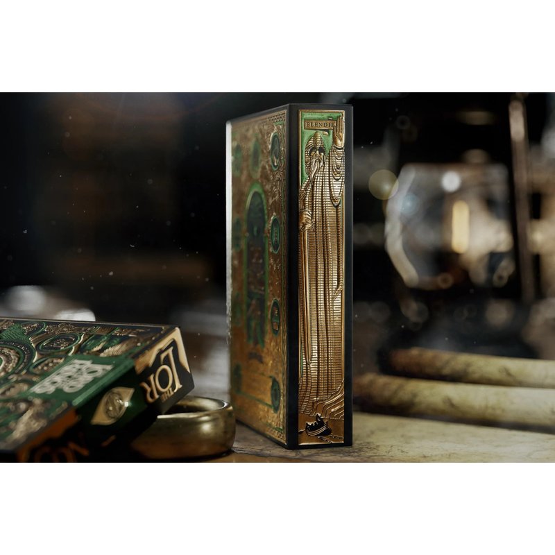 Crafted with the gold that Sauron used to forge the One Ring, along with emerald green foil that reflects the luscious landscape of The Shire, the box is truly one of a kind. The cards themselves are made in the USA - printed on FSC-certified paper derived from sustainable forests, using vegetable-based inks and starch-based laminates.