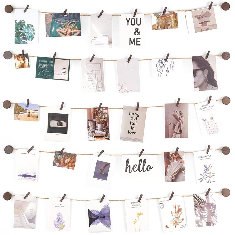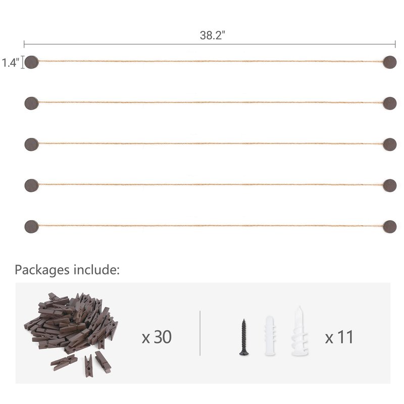 - This hanging photo display will save you time. It comes with hanging accessories and it is easy to install. The hanging frame collage wall set includes 5 hemp ropes and 30 wooden pins. You can hang at most 30 pictures.You can get creative on install and pictures hanging.