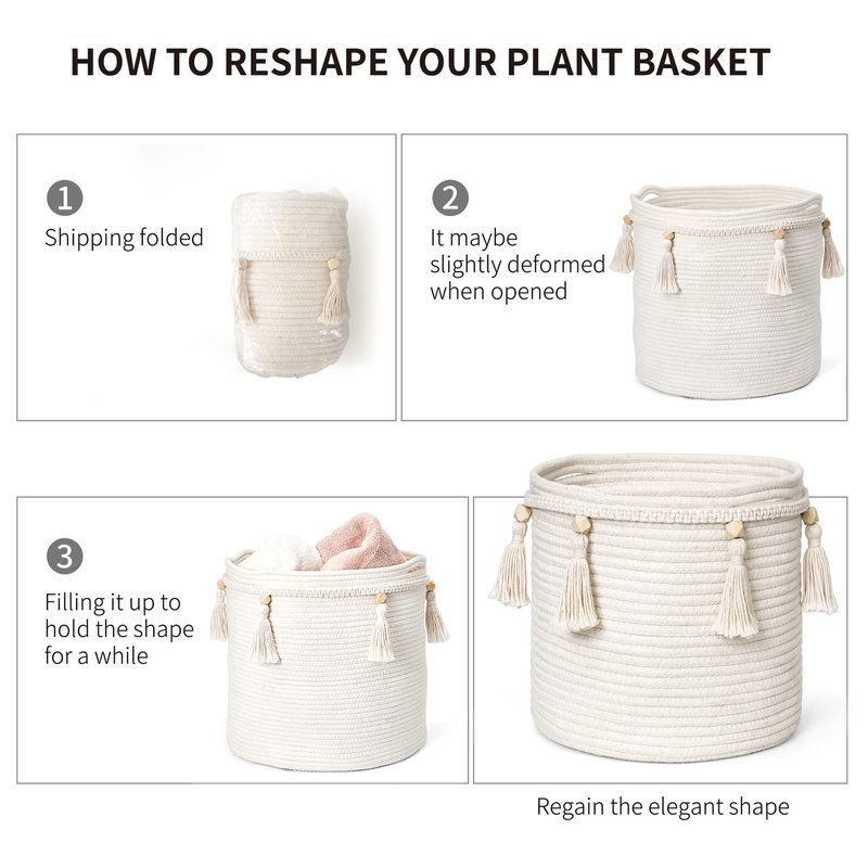 - Material: Natural cotton rope. The size is: 11" Length ×11" Width, Made from eco-friendly and healthy material. Shipping folded could make the basket distort for a little, but the flaws in the bend will disappear over time. Using baskets or filling them will help speed up the process.