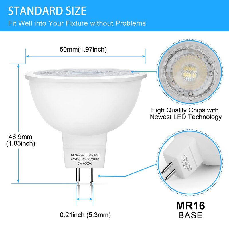 - Easy installation: Standard MR16 bulb shape dia1.97*1.85 inch with GU5.3 base. Can be easily to replace traditional MR16 halogen bulbs and fit well into your fixture without problems. Perfect for landscape, recessed, track lighting, etc. Notice: this bulb is used to replace 1.97inch (50mm) MR16 halogen bulb, not 1.38inch (35mm) diameter MR11 lamp. Note: Please measure the dimension and bulb socket of your light fixture to confirm our bulbs can be used