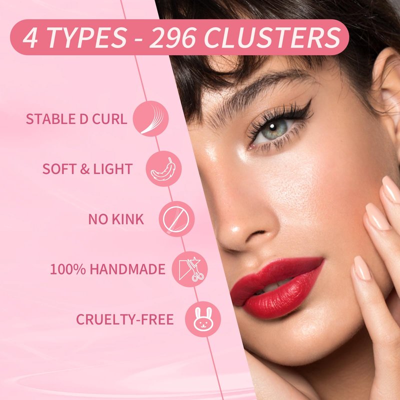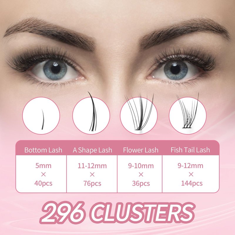 - 【4 TYPES INDIVIDUAL LASH WITH GLUE】You will get 296 pcs individual cluster lashes and 1.5ml glue, including 4 styles of mixed volume clusters. Brand new upgraded DIY individual lashes, you can DIY according to your need. Usually, only 4-5 clusters of lashes are needed for one eye. Just like salon lash extensions but easier and faster. The important thing is that you can do it yourself at home and save a lot of money.