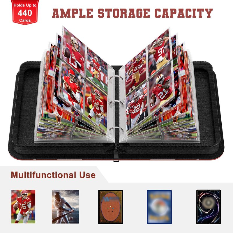- 【Large Capacity】The 3 ring design allows you to easily add or remove pages. The football card binder includes 55 pages of double-sided 4 pocket card sleeves binder sheets, with a total capacity of up to 440 football cards, offering ample space to organize and display your precious collection.