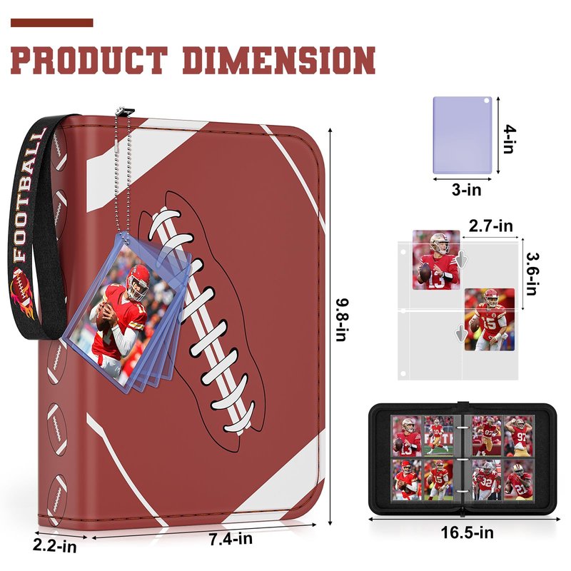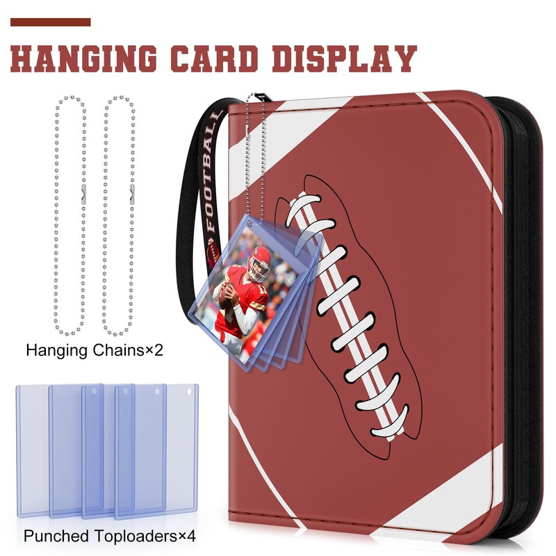- 【Unique Design】The newly upgraded football card binder seamlessly combines display and storage functions. Equipped with 4 punched hard plastic card protectors and 2 hanging chains, it is meticulously designed to showcase your treasured cards. The football-patterned wristbands offer easy portability, letting you to display your prized football cards anytime, anywhere.