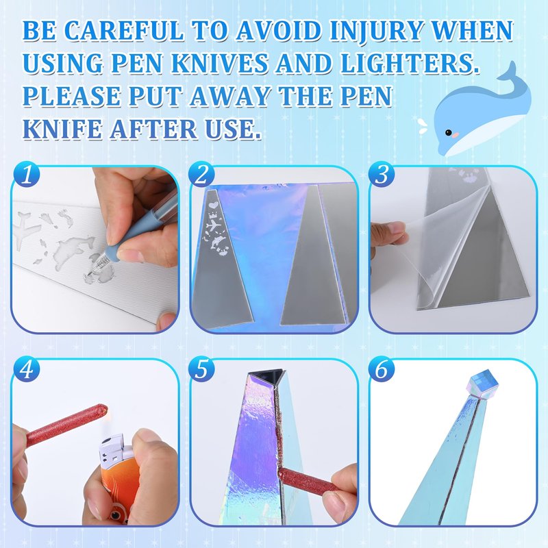 - [DIY Kaleidoscope Craft Kit]: This DIY kaleidoscope craft kit contains materials that allow you to extend your creativity infinitely. It is equipped with a ruler, a variety of pattern molds, two glue sticks, a safety-designed automatic rebound knife, transparent tape, and a cube sun catcher to ensure that the creation process is both convenient and safe. In addition, the kit also includes one dazzling color-changing laser papers and three acrylic lenses,Waiting for your wonderful ideas