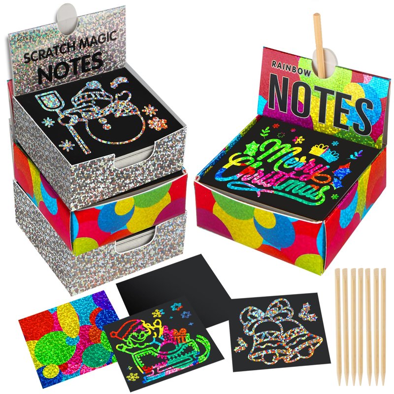 - Mini Scratch off Art: Novelty magic scratch notes with a fun metallic glitter layer hidden under the black coating; comes with 4 box each containing 100 sheets of holographic scratch paper, 2 stylus pens. Enough counts to allow kids play together and create their own fun graphics or designs freely