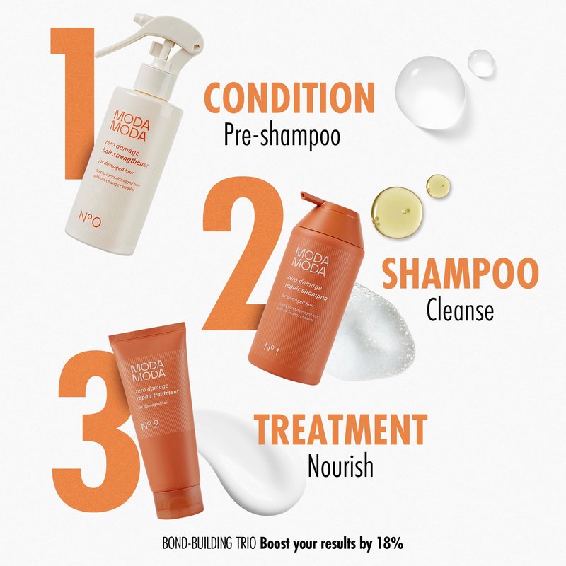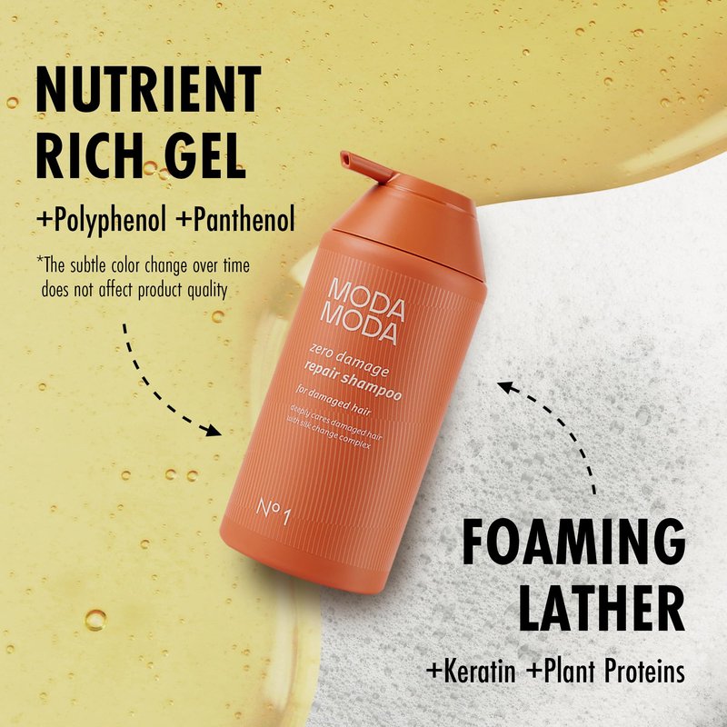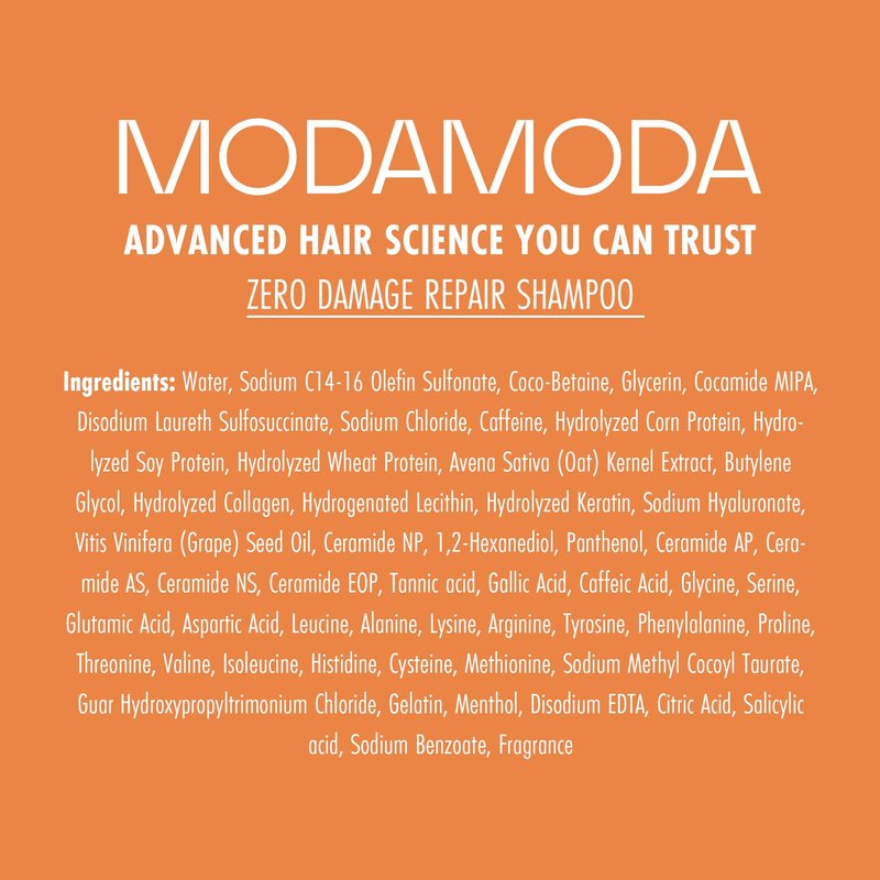 - ✅ ZERO DAMAGE DAILY SHAMPOO FORMULA. Experience the transformative power of MODAMODA Zero Damage Bond Repair Volume Shampoo, specially designed for damaged hair. With MODAMODA’s propriety blend of Polyphenol Complex, it repairs and replenishes your hair, improving the fundamental structure and delivering zero damage results.