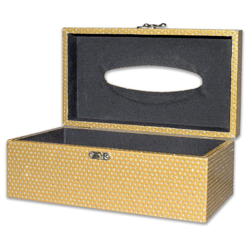 - Elevate any room's decor with this stylish and functional rectangular wooden tissue box cover holder, featuring a shimmering gold glitter leather design and metal clasp for added durability.