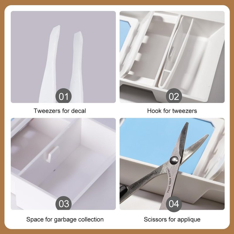 - Decal box includes: decal operation box with storage function, sponge, curve tweezers