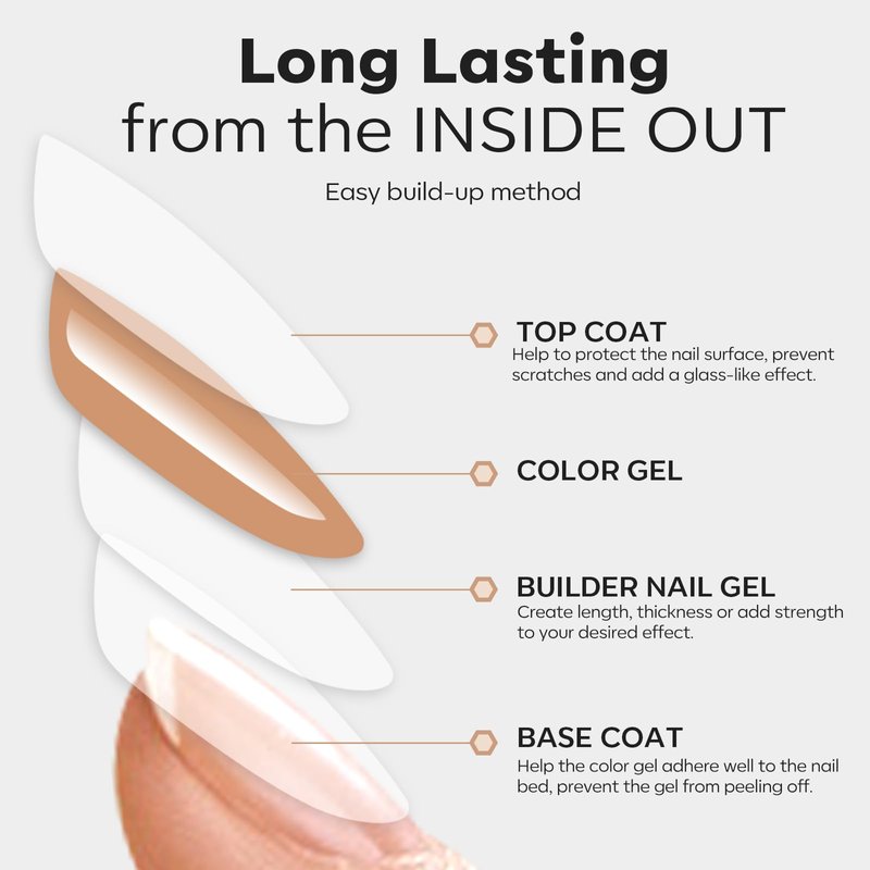 - 1+2>3 Nail Thickening Build-up Triology: Upgraded Nail Thickening Protection Trio Set with 1*10ml Clear Builder Nail Gel + 1*10ml Acid Free Base Coat + 1*10ml Shiny Top Coat. Exclusive combination for providing triple nail thickening protection for thin, soft, or brittle cracked nails, perfect for building the look you’ve always dreamed of, and achieving the best modern salon-looking gel mani at home with a small fee. Note: Need to be cured under U V/LED lamp for 60-90s