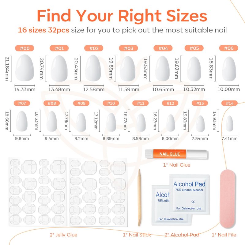 - 32 pcs Nails in 16 Sizes: The press on nails kit comes with 32pcs fake nails in 16 different sizes to suit each finger, each set comes complete with a nail glue, 2 sheets jelly adhesive tabs, double-sided nail file, cuticle stick, and alcohol pad.