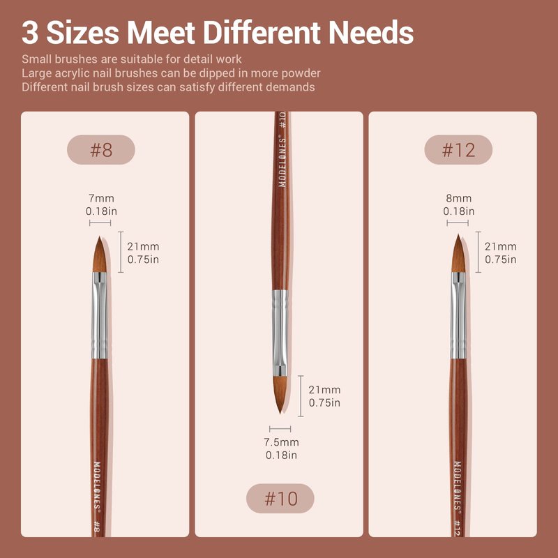 - Professional Acrylic Brush Set: Modelones Nail Brushes Set contains 3 different sizes (size 8/10/12) and can satisfy all your acrylic nail art needs, such as nail extension, nail carving, Fine drawing on nail tips, etc.