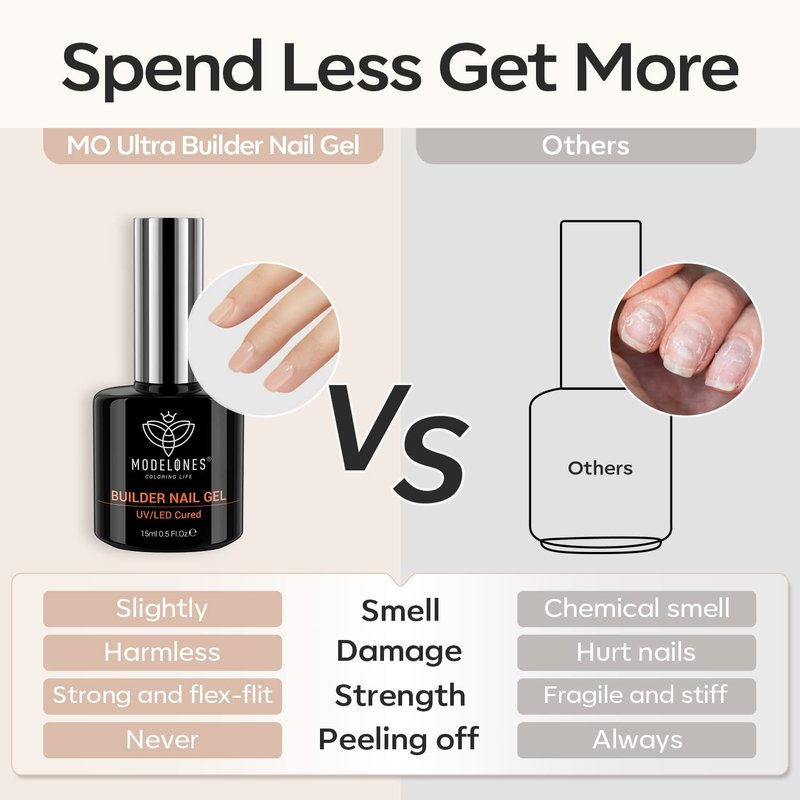 - SAFE & HEALTHY: Modelones nail thickening gel builder features healthy and 11 toxin-free ingredients. No harsh ingredients or adhesives that lead to damaged nails, paraben & cruelty-free, anti-chipping, low odor and skin-friendly.
