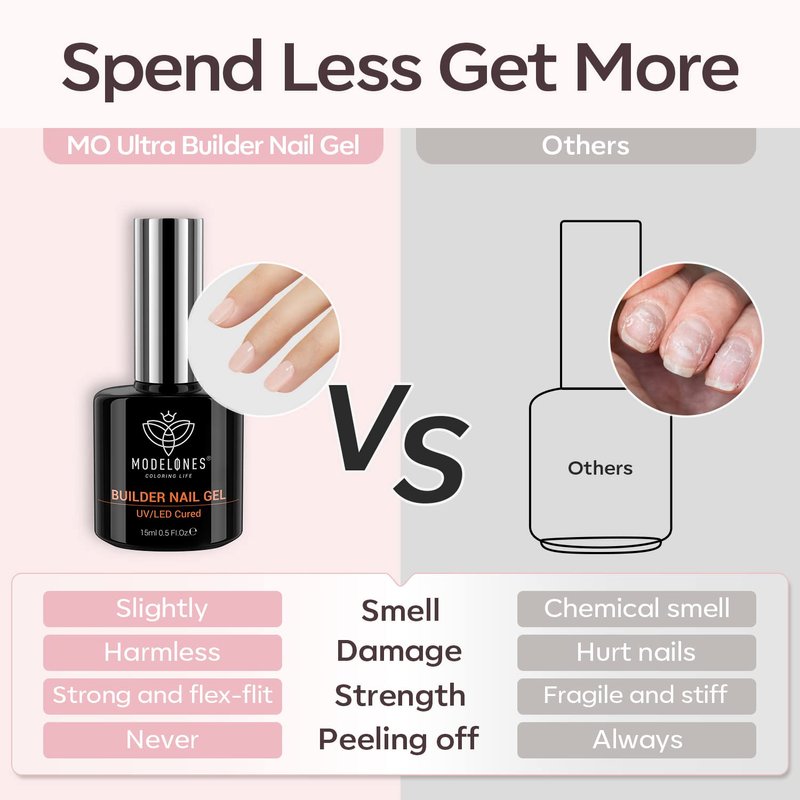- SAFE & HEALTHY: Modelones nail thickening gel builder features healthy and 11 toxin-free ingredients. No harsh ingredients or adhesives that lead to damaged nails, paraben & cruelty-free, anti-chipping, low odor and skin-friendly.