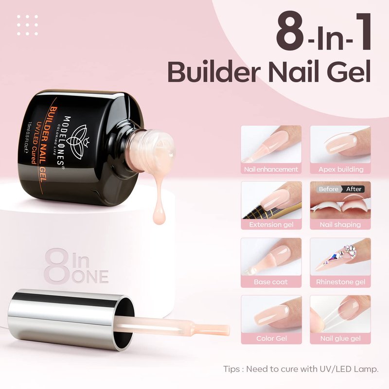 modelones Builder Nail Gel, 8-in-1 Cover Nude Gel Builder, LED Nail Lamp Cured Hard Gel Builder for Nail Thickening Nail Strengthener Extension Gel Rubber Base Gel Polish Glue Gel in a Bottle