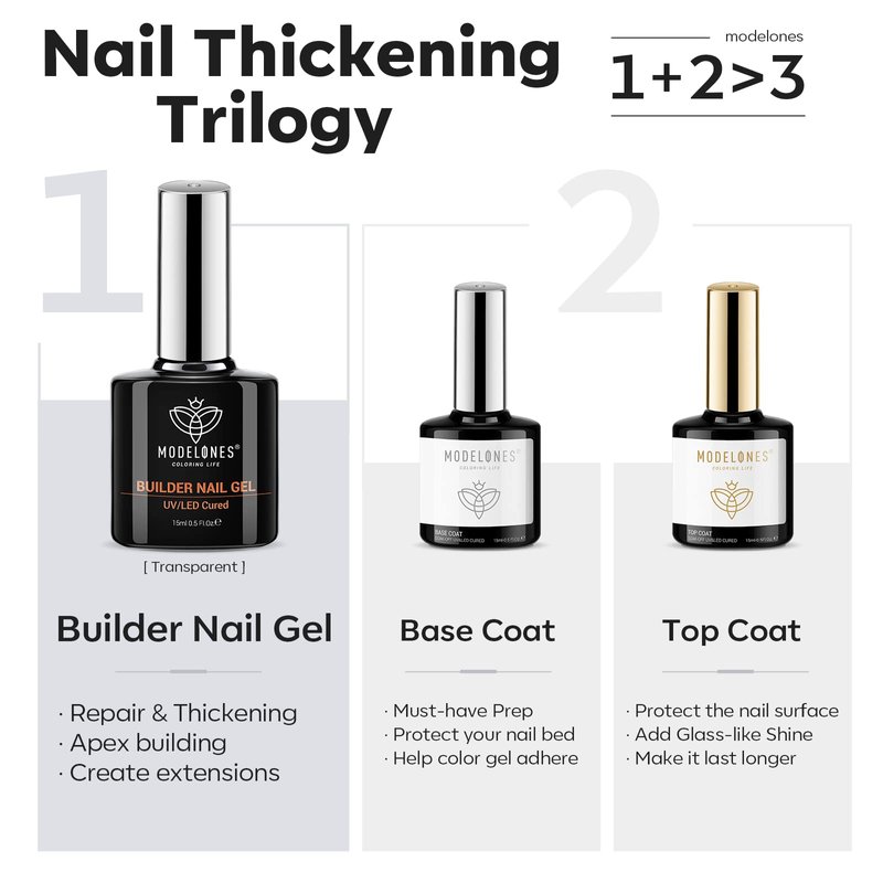 - 1+2>3 Nail Thickening Build-up Triology: Upgraded Nail Thickening Protection Trio Set with 1* Clear Builder Nail Gel + 1*15ml Acid Free Base Coat + 1*15ml Shiny Top Coat. Exclusive combination for providing triple nail thickening protection for thin, soft, or brittle cracked nails, perfect for building the look you’ve always dreamed of, and achieving the best modern salon-looking gel mani at home with a small fee. (NOTE: Need to be cured under UV/LED lamp for 60-90s)