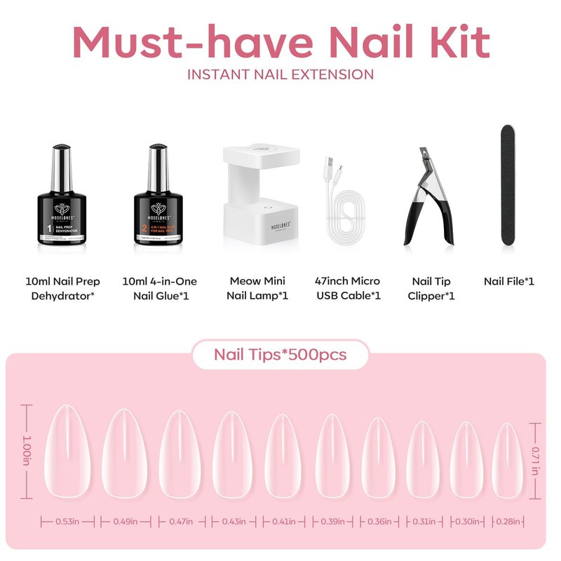 - Salon at Home: Modelones Gel Nail Extension Kit includes 1* 10 ml 4-in-One Nail Glue Gel, 500 pcs* Medium Alomnd Nail Tips, 1* Ultra-Portable U V / LED Nail Lamp, 1* 10 ml Nail Dehydrator, 1* Nail Tips Clipper and 1* Nail File ! Our gel nail kit is convenient for you to polish the look you’ve always dreamed of, and achieving the best modern salon-looking gel mani at home with a small fee