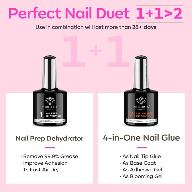 1. Modelones all-new Nail Tips & Glue Gel Kit includes 1*Ultra-Portable U V/LED Nail Lamp, 1*10ml4-in-One Nail Glue Gel, 1*10ml Nail Prep Dehydrate, 500pcs Coffin Nail Tips, 1*Nail File, and 1*Nail Tips Clipper! The Newest, The Fastest, Most Professional, Nail enhancement for all of your nail art needs in 2021 New Nail Art.