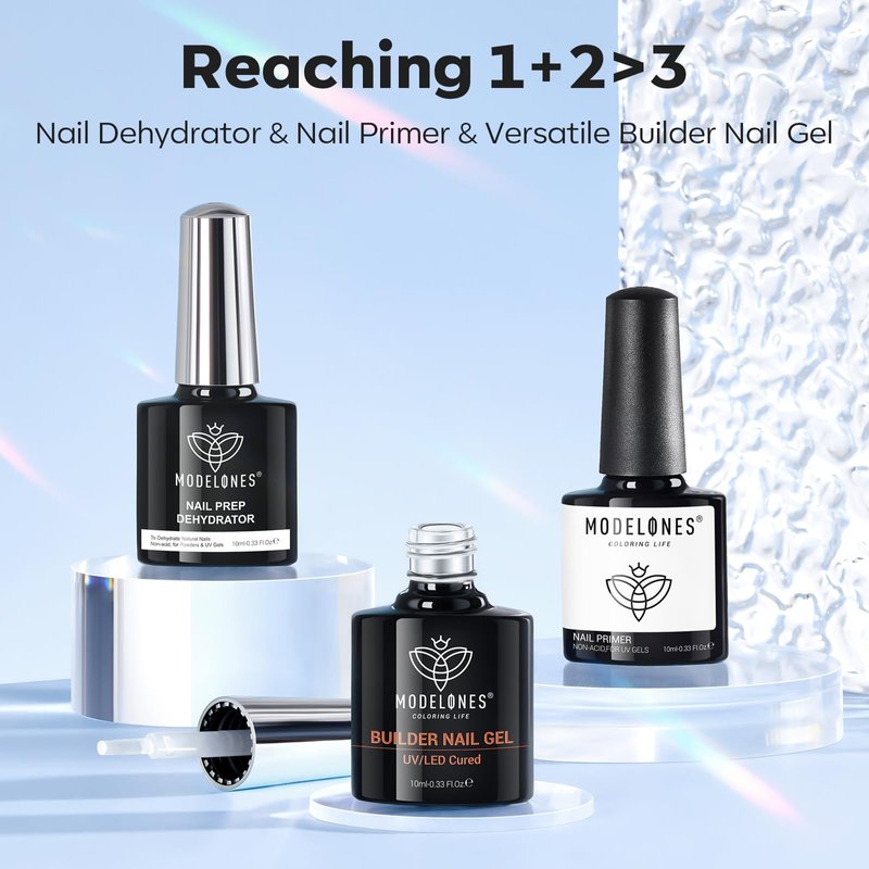 modelones Nail Dehydrator and Primer with Builder Nail Gel, 3Pcs Nail Prep Dehydrate & Bond Primer Clear Gel Builder Nail Polish Base Coat for Nail Strengthener Apex Building, LED Nail Lamp Cured