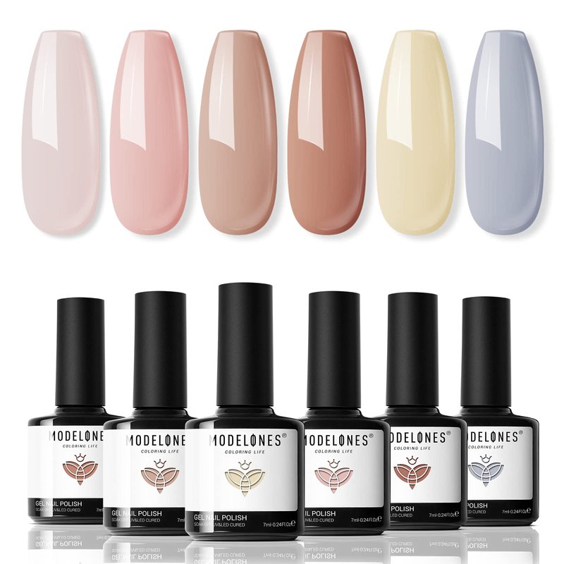 modelones Nude Gel Nail Polish Set - 6 Colors Neutral Skin Tone Gel Polish Soak Off Pale Pink Nail Polish Gel Peach Brown Gray Blue Gel Nail Kit All Seasons Nail Art Manicure Gifts DIY Home