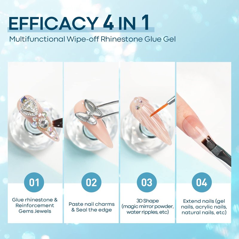 Modelones Rhinestone Glue for Nail, No Wipe Nail Gem Glue, Super Strong Adhesive Glue Gel with Nail Charms & Dual-Use Nail Brush for Nail Rhinestones/Nail Jewelry/Nail Diamonds, 4 Piece Set