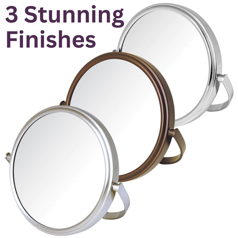- TABLETOP VANITY MIRROR - This sleek, round mirror looks stunning on any vanity or bathroom counter. The modern, nickel finish base matches a variety of home styles and aesthetics. This tabletop mirror is great for getting ready, especially for styling hair and applying makeup. The magnification offers a close-up view, allowing you to see every detail and perfect your look!