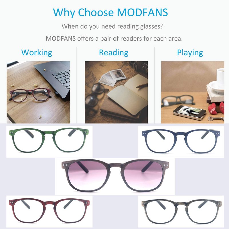 MODFANS Reading Glasses Women/Men Wood Look Round Frame Includes Sun Readers glasses for outdoors 5-Pack Comfort Flexible?Spring Hinge Lightweight with soft case 3.5