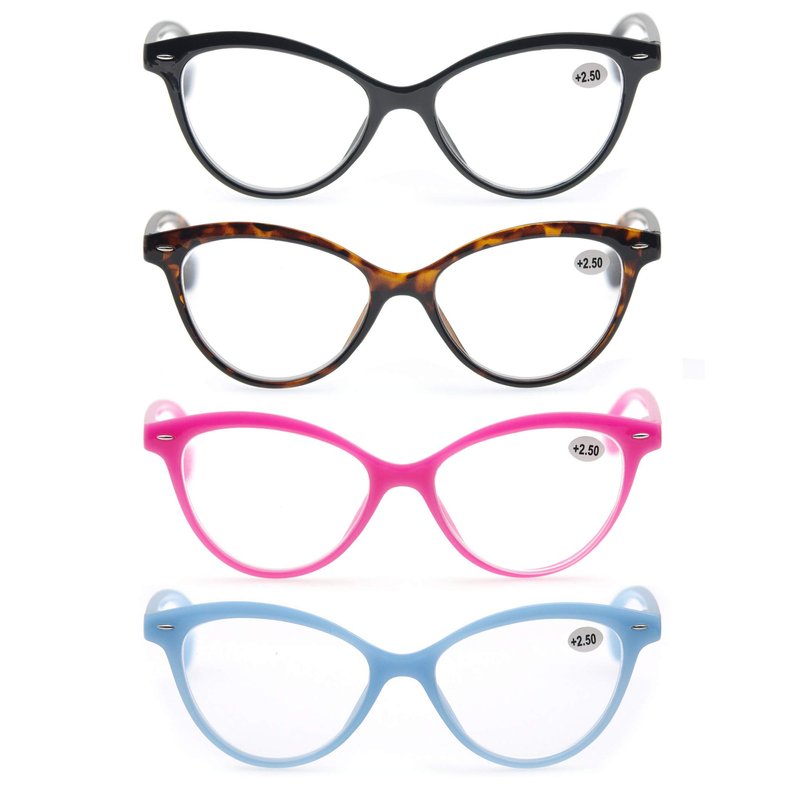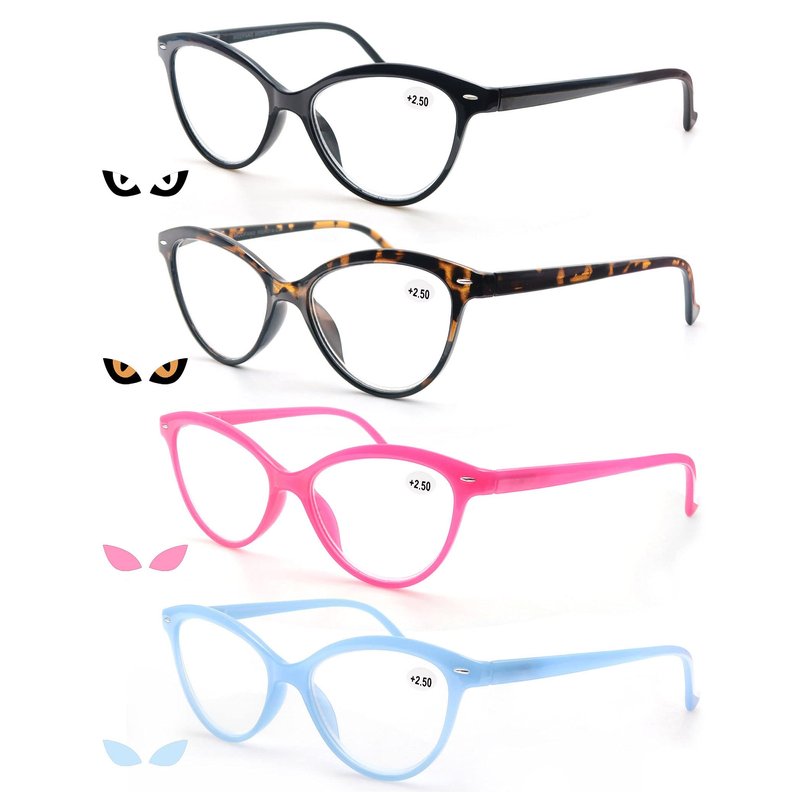 MODFANS Cat eye reading glasses have a stylish look and crystal clear vision.There are 4 colors in one pack (pink, blue, tortoise, black)