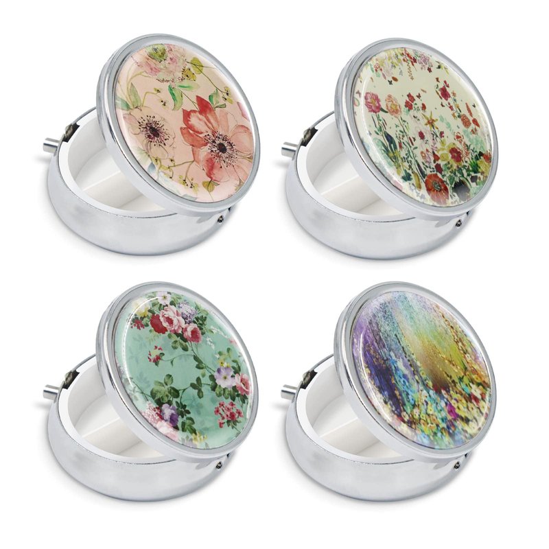 Modixun 4 Pack Elegant Small Pill Box, 3 Compartments Pill Case for Purse Pocket with Mirror, Metal Travel Portable Medicine Tablet Vitamin Holder Organizer Container, Style A