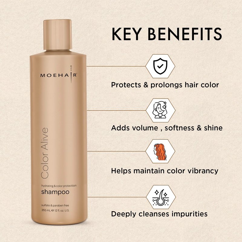 - ✔️HOW TO USE COLOR ALIVE SHAMPOO — Take a generous amount of Moehair Color Alive Shampoo on your palm. Apply the shampoo on wet hair from root to tip, and gently massage while the shampoo lathers. Rinse thoroughly and repeat if required. Follow up with Color Alive Conditioner for best results. Preserve the vibrancy and prevent the color from fading using the color-protect shampoo and conditioner set