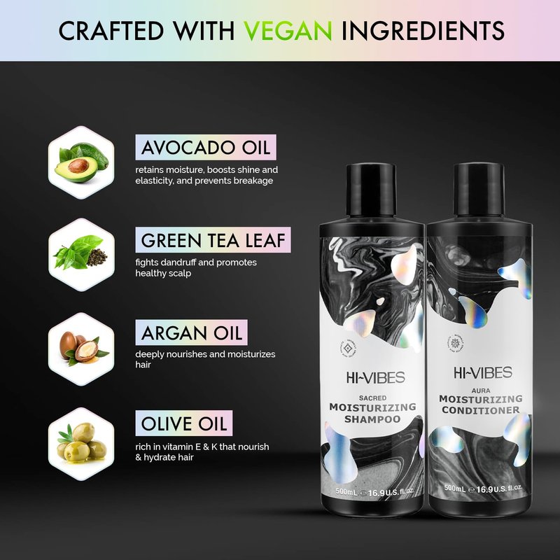 - ✔️ HOW TO USE THE COMBO – Add the vegan shampoo and conditioner to your regular haircare regime. The combo improves overall vitality, and is infused with hair-boosting proteins. Take a generous amount of the Hi-Vibes vegan moisturizing shampoo, apply it on wet hair, and rinse off. Repeat as required. Follow up with the Hi-Vibes vegan hair conditioner, allow it to sit for 3 to 5 minutes, and rinse thoroughly with cold or lukewarm water