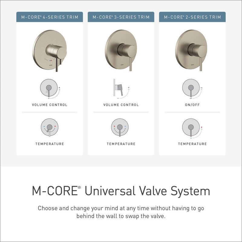 - VERSATILE DESIGN: M-CORE’S adaptability allows the valves to be roughed-in with the option of functionality and style changes that don't require removing or changing the valve(s)