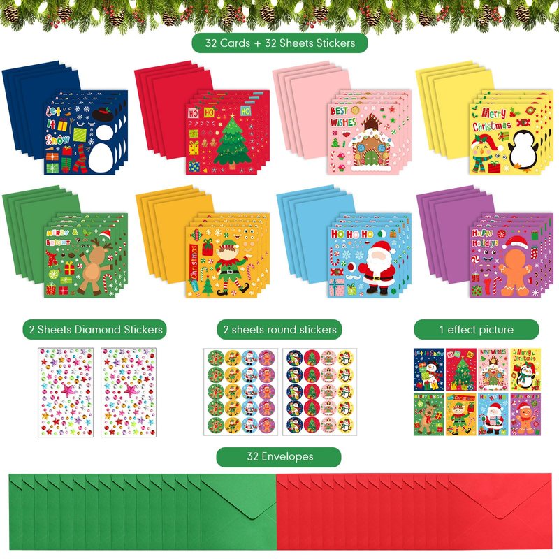 - Package Content: you will receive 32 packs of Christmas crafts including 32 cards and 32 sheets stickers, both in 8 styles, 32 envelopes, 2 sheets round stickers, 2 sheets diamond stickers, 1 effect picture; Enough for your Xmas DIY greeting card needs