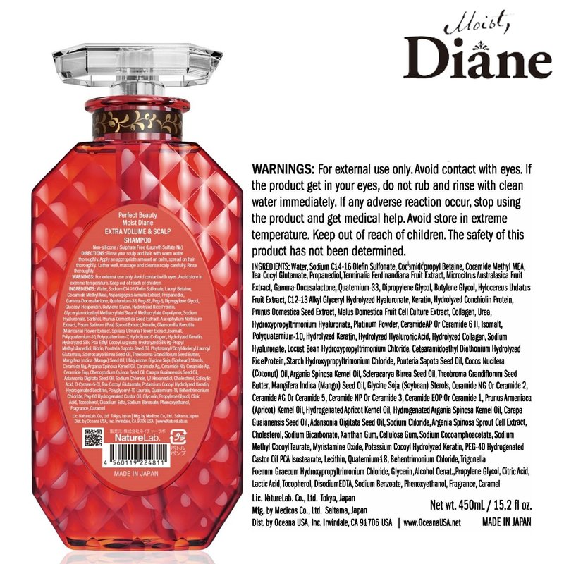 Moist Diane Natural Hydrating Hair Shampoo with Pump for Men & Women, Organic Keratin Japanese Moisturizing Shampoo for Dry Scalp, Silicone & Sulfate Free, Extra Volume & Scalp 15.2 fl oz/450 ml