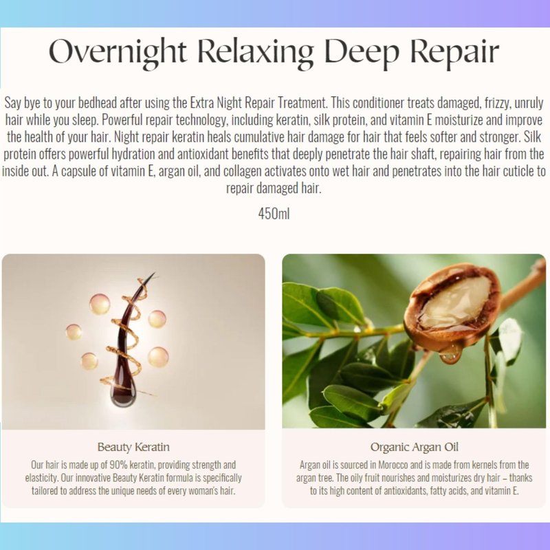 - 【Intensive Nighttime Recovery While Sleeping】Delivers deep hair repair with Night Repair Keratin, actively restoring damage from chemical treatments while you sleep.