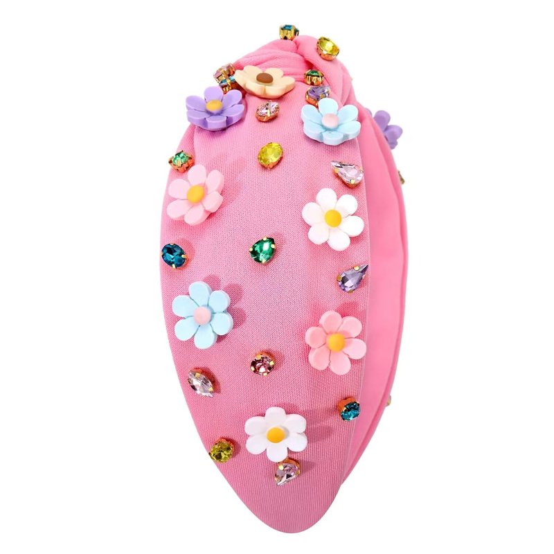 Bloom, blossom, and grow! Design to capture the beauty of a blooming flower, these white/pink wide top knot headband accent with cute colorful acrylic daisy flower charms.