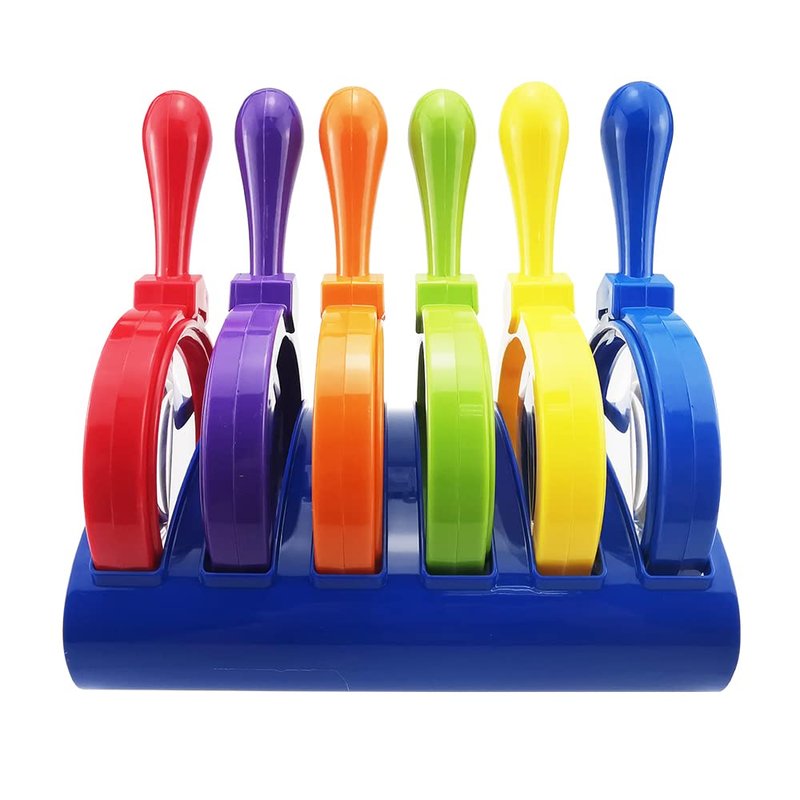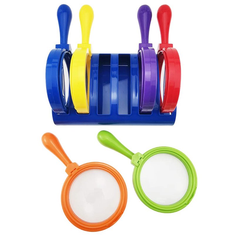 - COLOR THE FUN -Each magnifying glass comes in a different bright color include red,orange,yellow, green, blue, purple.A variety of colors,looks like the rainbow general good.The design of the stand makes the product more convenient and tidy .