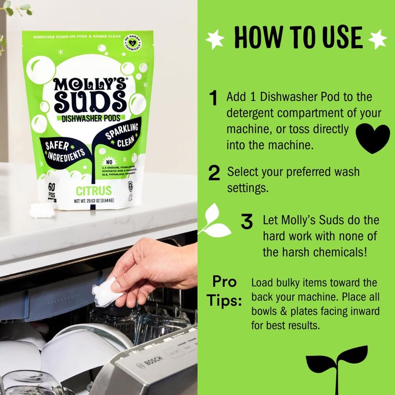 - CONVENIENT & EASY TO USE: A single auto-release pod works to clean 1 full load of dishes. Safe for use on glassware, porcelain, stainless steel, pots & pans, baby bottles and more! Simply rinse dishes with hot water prior to loading in your dishwasher (works with built-in, portable & drawer styles), add pod, select your preferred wash cycle and let Molly’s Suds do the hard work!